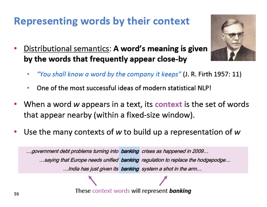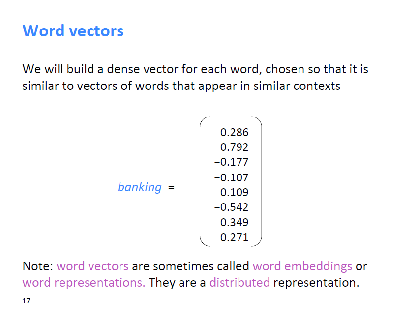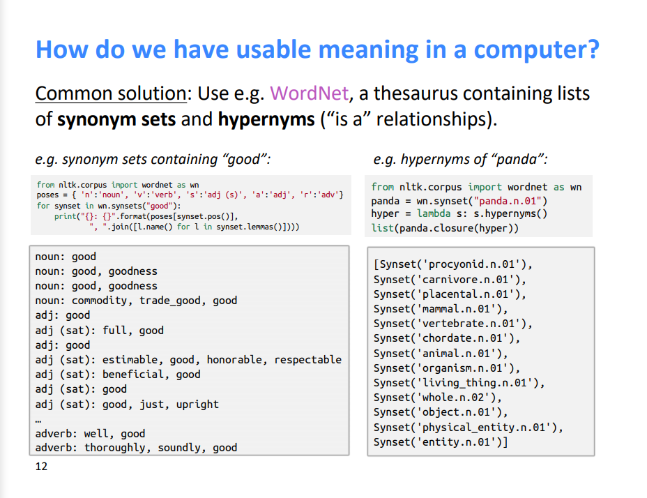 전통적인 NLP에서 우리는 단어를 구별 된 의미로 살펴봤습니다. hotel, motel 은 비슷한 표현이지만 컴퓨터는 둘을 one-hot vector으로 바꾸기 때문에 독립된 단어로 인식합니다.