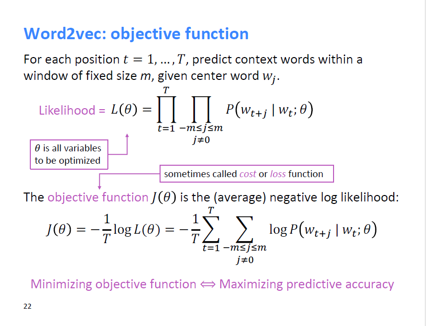 Likelihood가 objective function부분으로 바꾼부분은 파리의 언어학도님의 블로그에 설명이 잘 나와있습니다. 우리는 여기서 확률적 고찰 J'(세타)을 마치고 기계학습의 관점에서 생각을 해보자. J(세타)가 기계학습의 관점으로 변경한 수식인데, 이 때 수식에 -1/T이 추가되고 log를 씌우는 일이 발생했다. 이 말은 바꿔서 말하면 Negative log-likelihood 방식으로 우류에 대한 loss를 계산한다는 이야기입니다. Negative log-likelihood 방법은 기계학습에서 많이 사용되는데, 확률 수식 J'(세타)가 최대확률값을 반환하는 파라미터들을 찾는 문제였다면, 기계학습에서는 손실값 J'(세타)을 최소로 하는 파라미터를 찾는 일로 바꾼 것이다. 그래서 negative부분은 -1/T 를 의미하고 log를 씌우는 이유는 p값이 1이하로 매우 작아서 이를 커지게 함으로써 계산의 편리함과 loss값의 분포를 regular하게 만드는 효과가 있다.