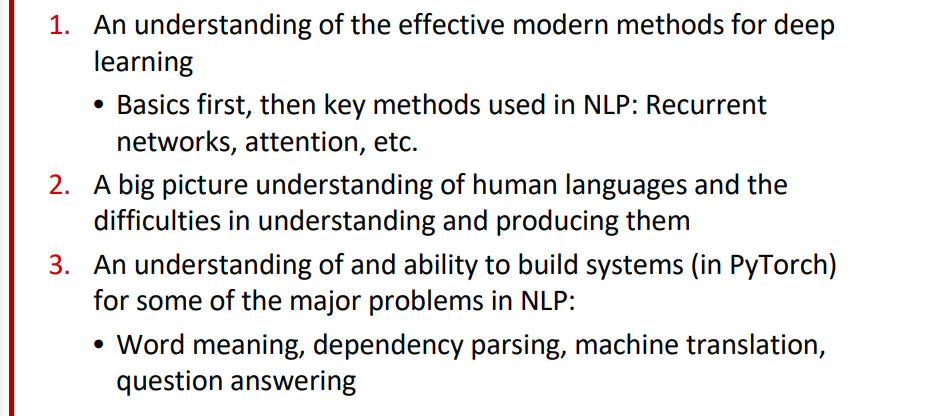 CS224n의 강의를 통해서 배울 수 있는 것은 아래와 같습니다. 첫째로, attention과 같은 최근 deep learning의 기법들을 배우고 이해할 수 있습니다. 두번째로, 사람의 언어가 왜 이해하기 어려운지 그리고 어떻게 생산해야 하는지, 이해해야 하는지에 대해 알 수 있습니다. 마지막으로, PyTorch를 이용하여 자연어처리의 많은 문제들을 해결할 능력을 기를 수 있습니다.