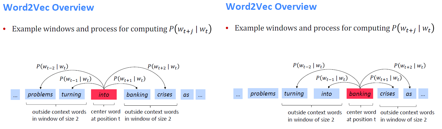 이제 수식을 살펴보도록 하겠습니다. t = 1, ... , T (T = 단어의 갯수)를 가지고 window size를 m으로 설정할 때 다음의 Likelihood를 계산하게 됩니다. 위의 식을 예시로 하면, T는 9이고 m은 2로 설정되어지고 The부터 dog까지 9번의 과정을 거칩니다. 그리고 그 과정속에서 m = 2일때, P(wt+j | wt ; ceta)를 곱한 값을 계산합니다. 마지막으로 log를 씌움으로써 곱하기를 더하기로 바꾸고 최종적인 목적식을 최적화하도록 설정되어있습니다.