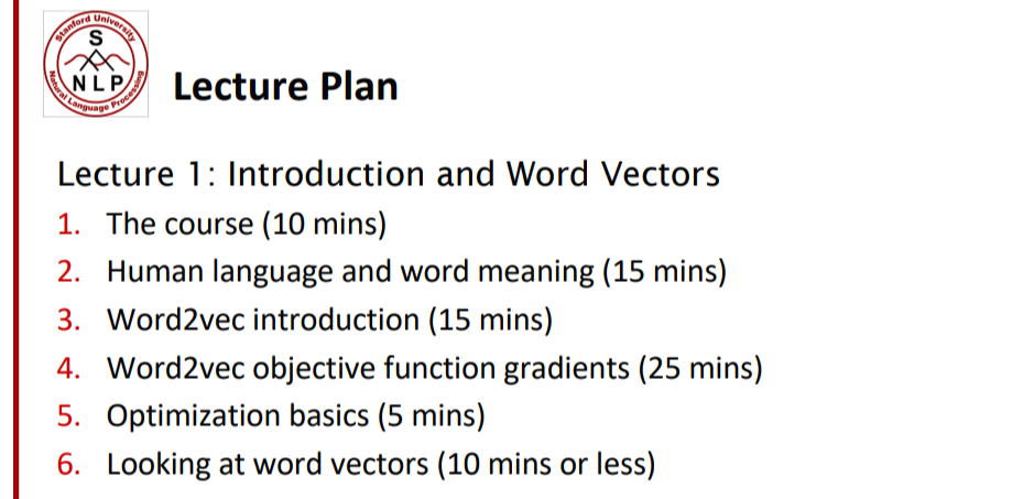 CS224N의 1주차 강의 Introduction and Word Vectors의 강의 순서입니다. 기본적인 인간의 언어에 대해 먼저 이야기를 하고 Wor2Vec와 Gensim에 대해서 이야기를 진행합니다.