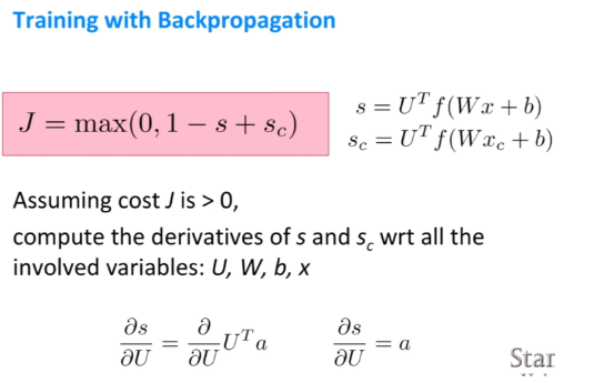 우리는 앞서 작성한 max-margin 손실함수를 통해 손실값을 구했다. 이제 이 손실값에 각 파라미터 W, U, b, X가 손실값에 얼마나 많은 기여를 했는지 알아보고 해당 기여도에 따라 각 parameter 값을 조정해보자. 일단 손실값이 발생했을 때를 가정해서 업데이트를 해보자. 편미분J/ 편미분U를 해야하는데, 사실상 J= Sc값에 의해 좌지우지 되고, 편미분J/편미분s = - 편미분J/편미분Sc = -1이기 때문에 손실값 J를 s라고 봐도 무방하다. 따라서, 에러에 대한 U의 기여도를 알기위해 손실값 U로 편미분하면 편미분s/편미분u = a = Wx + b가 된다.