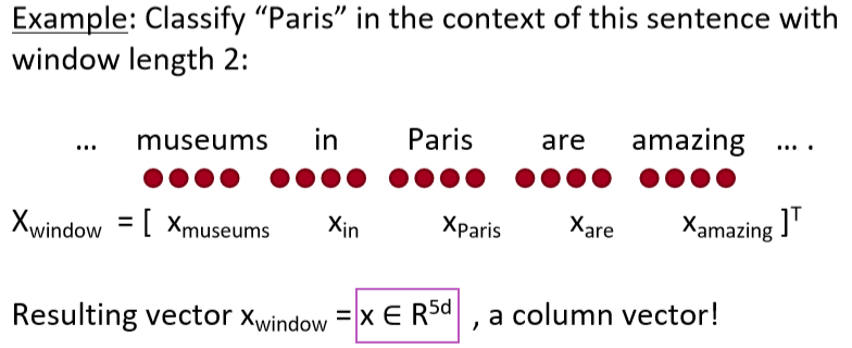 Example : "Paris"를 window length 2로 분류하기 위해서, 먼저 주변단어와 중심단어를 합칠 필요가 있습니다. 그러면 합쳐진 벡터의 크기는 5d의 크기를 가지게 됩니다.