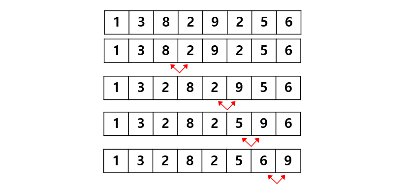 아래는 정렬의 방법 중 하나인 버블 정렬에 대해서 설명한 예시에서 나온 그림입니다.