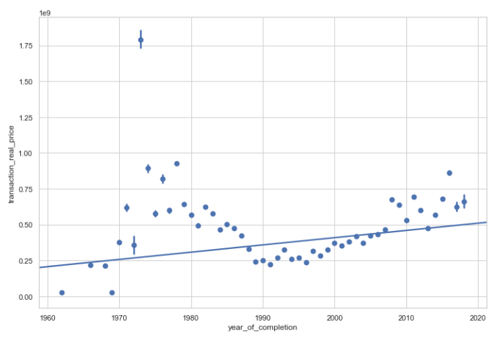 먼저 완공년도를 의미하는 year_of_completion과 Target변수와의 regression plot을 살펴보면 아래와 같습니다.