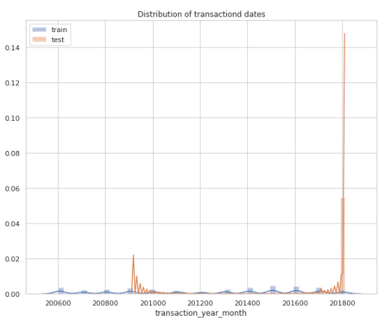 학습데이터와 평가데이터의 거래기간을 살펴보면 이상한 점을 발견할 수 있습니다. 학습데이터는 거래가 고른반면 평가데이터는 2009~2010년, 2018년 두 부분에 집중적으로 몰려있습니다. 이는 추후에 자세히 살펴보도록 하겠습니다.