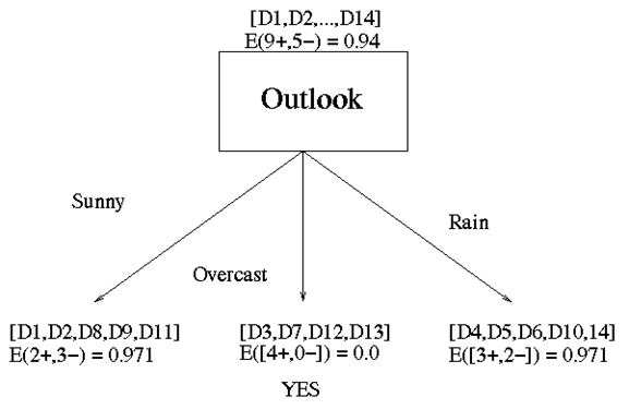 - G(S,Outlook) = E([9+,5-]) – [5/14*E(2+,3-) + 4/14*E([4+,0-]) + 5/14*E([3+,2-])]