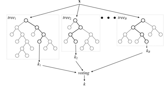 오버피팅 문제를 극복하기 위해 Bootstrapping(bagging)을 통해 만든 의사결정숲입니다. 숲이라고 표현한 것은 tree1과 같이 여러개의 의사결정나무가 모여서 하나의 모델을 만들기 때문입니다.
