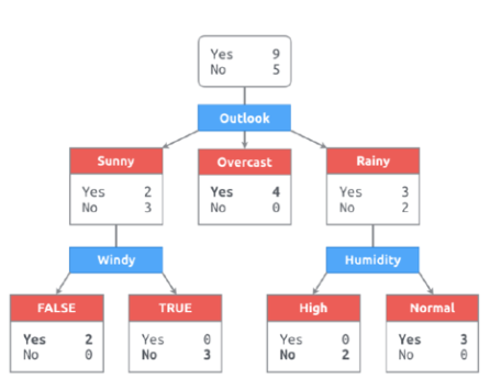 - G(S,Outlook) = E(S) – [5/14 * E(Outlook=sunny) + 4/14 * E(Outlook = overcast) + 5/14 * E(Outlook=rain)]