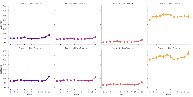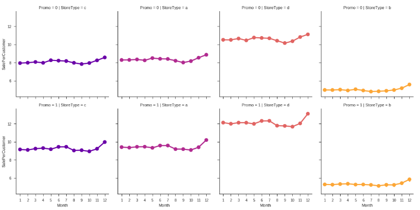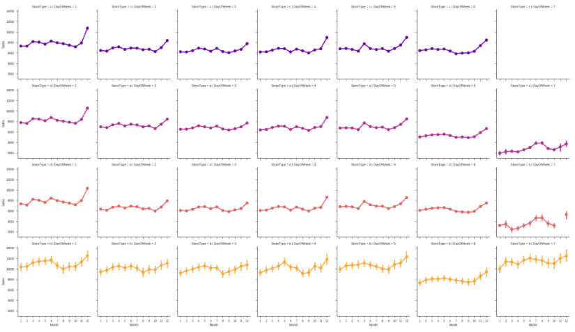 이 그림을 가로로 읽을 수 있습니다. 각 수평 쌍은 A에서 D까지 하나의 'StoreType'에 대한 것입니다. 일반적으로 이러한 도표는 계열과의 상관 관계를 표시합니다 (x 시간 단위로 표시되지 않음).