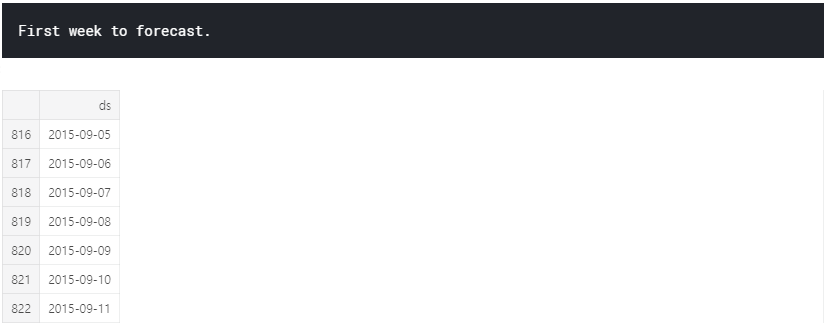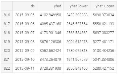 forecast[['ds', 'yhat', 'yhat_lower', 'yhat_upper']].tail(7)