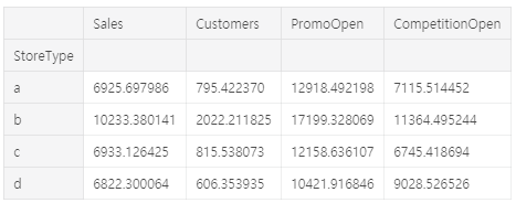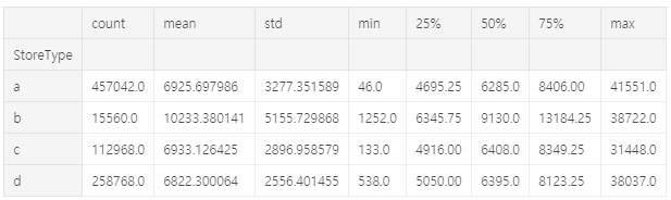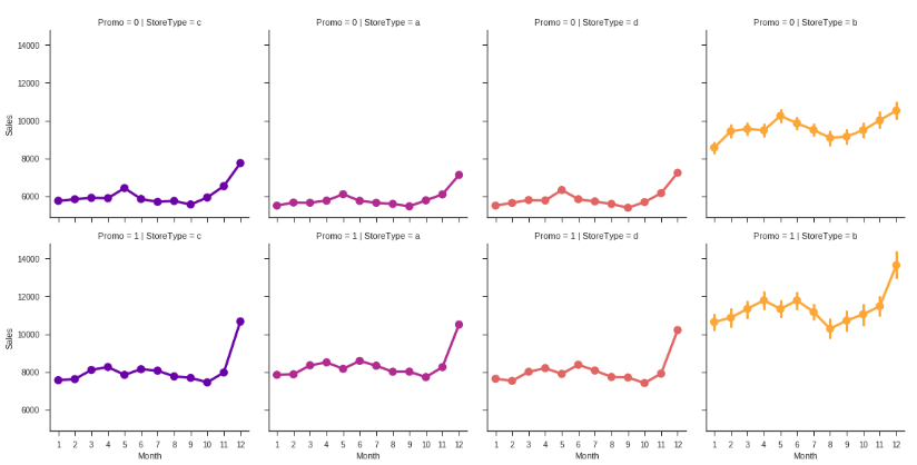 StoreType C (위에서 3 위)는 아니지만 전체 매출은 증가한 것으로 보입니다. StoreType A가 데이터 세트에서 가장 많이 판매되는 상점 유형 인 경우에도 택시는 StoreType C와 동일한 감소 궤적을 따르는 것으로 보입니다.