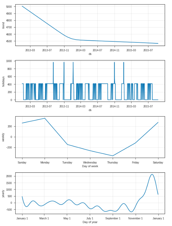 첫 번째 플롯은 매장 번호 1의 월간 매출이 시간이 지남에 따라 선형 적으로 감소하고 있음을 보여주고, 두 번째 플롯은 모델에 포함 된 홀리 아이 간격을 보여줍니다. 세 번째 줄거리는 지난 주 판매량이 매주 다음 주 월요일에 최고치 인 반면, 네 번째 줄거리는 크리스마스 연휴 기간 동안 가장 붐비는 계절이 발생한다는 것을 보여줍니다.