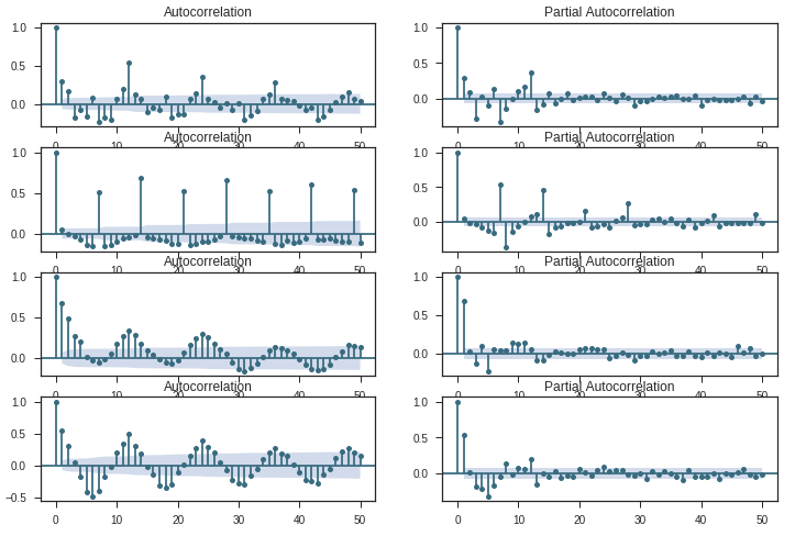 각 쌍의 플롯에 공통적 인 두 가지가 있습니다 : 시계열의 비 랜더 런스와 높은 지연 -1 (더 높은 차분 d / D가 필요할 것입니다).