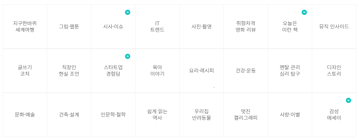 브런치에서 추천되는 카테고리는 아래의 5가지로 정리됩니다.