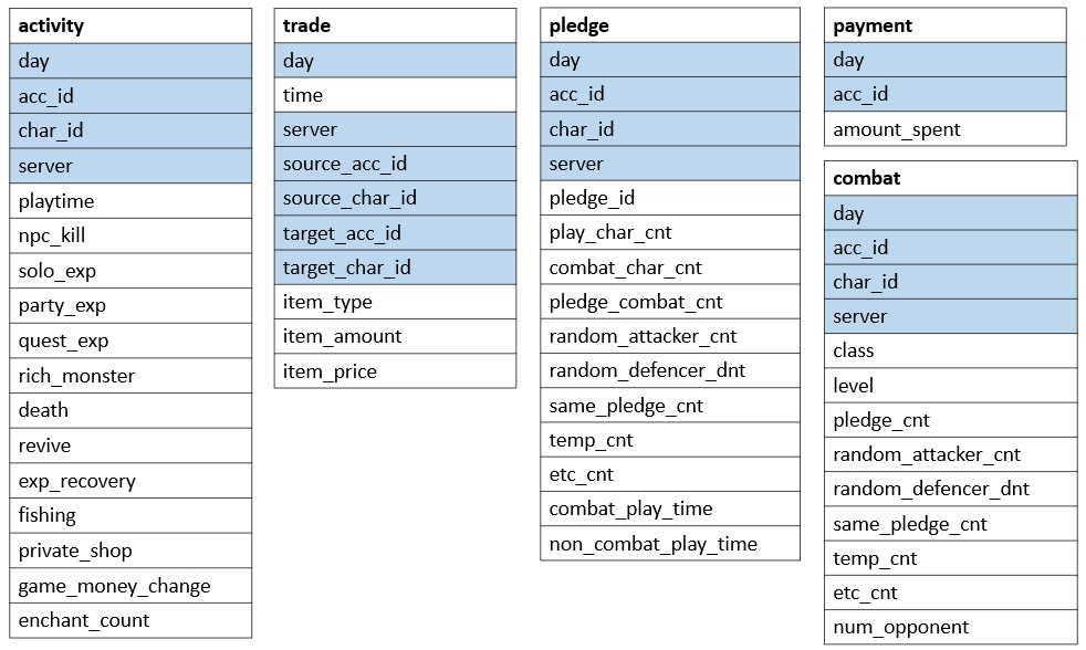 day, server, acc_id, char_id 4가지에 의해서 결합되는 형태이고, payment의 경우는 char_id가 따로 없이 char_id의 모든합을 acc_id의 payment에 넣은 형태입니다.