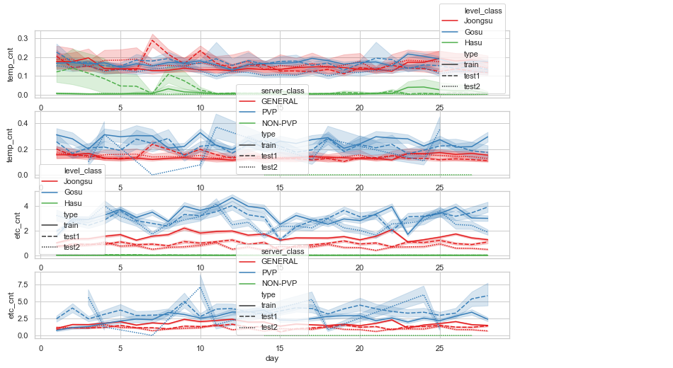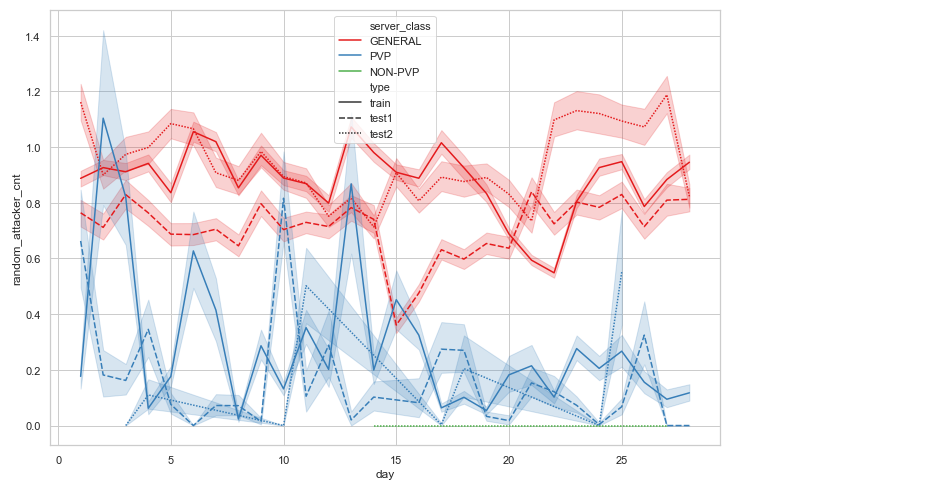 자료 조사를 하면서 가장 이해가 가지 않은 부분이 same_pledge_cnt입니다. 강함의 측정이나 장난 삼아서 같은 혈맹원을 공격한다고는 하지만, 9일이전과 이후의 패턴이 왜 차이가 나는지? 일반서버가 왜 PVP서버보다 높은지, 고수가 중수보다 높은지등의 이유는 잘 모르겠습니다.