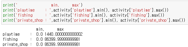 특징1. fishing의 값은 초(s)고 play_time은 분(60s)임. 그래서 둘 값의 차이를 비교하려면 60을 곱하거나 나누고 해야 합니다.