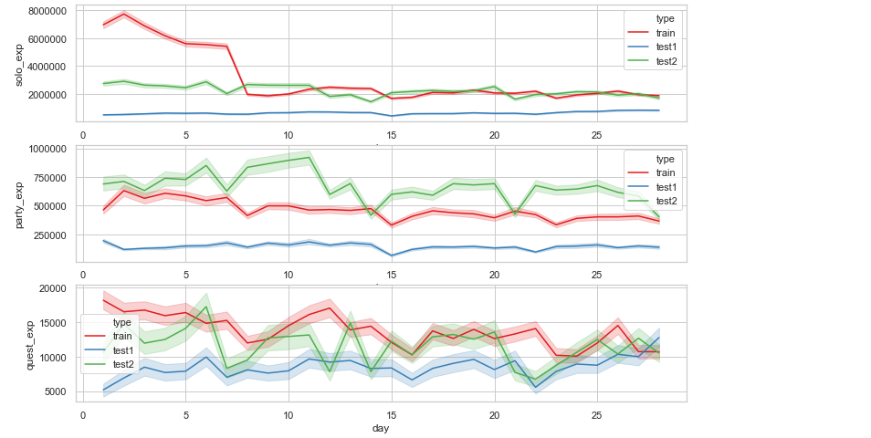 solo_exp는 거의 비슷하지만, party_exp는 train과 test1만 비슷하고 test2는 매우 다르다.