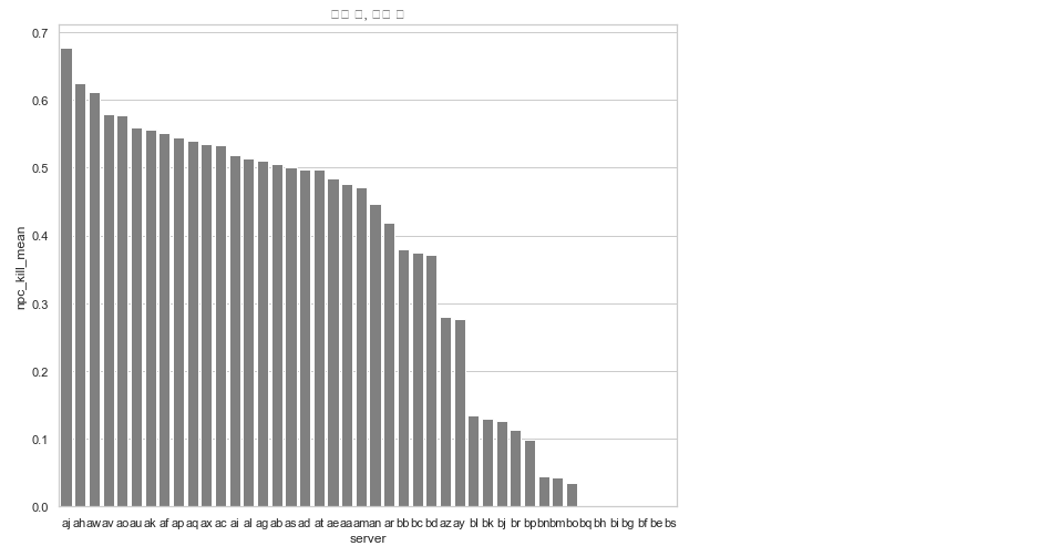 특징 : 이유없이 npc_kill이라는 변수가 8일전까지는 매우 높다가 9일에서 부터 급감하는 모습을 보입니다. 이유를 찾기 위해 서버별로, 서버의 특성별로 나누어서 살펴보도록 하겠습니다. 그 그래프는 아래에 있습니다.