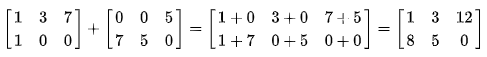 행렬끼리의 덧셈의 경우 행렬의 원소를 더하는 것인데, 주의해야 할 점은 행렬의 크기가 같아야 하는 점입니다. 예를 들어, 아래의 사진처럼 (2, 3)으로 두개의 행렬의 크기가 같아야 합니다. 다른 경우에는 아예 계산을 할 수 없습니다.