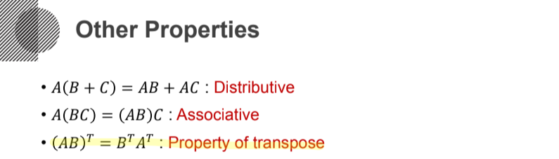 행렬의 다른 성질로는 분배법칙, 결합법칙, Transpose의 성질등이 있고 수식으로는 아래와 같다.