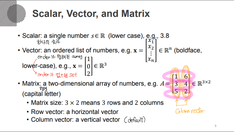 스칼라, 벡터 그리고 행렬은 선형대수의 값들을 표현하는 방식입니다. 스칼라의 경우 하나의 숫자로 표현하고, 벡터의 경우는 숫자들의 순서가 있는 리스트로 표현하고 행렬의 경우 배열이 모여서 값을 표현합니다.(하나의 배열로 이루어진 경우도 행렬이라고 할 수 있습니다.) 선형대수에서 중요한 점은 Vector의 표현은 기본적으로 Column vector을 기준으로 하는 점입니다.