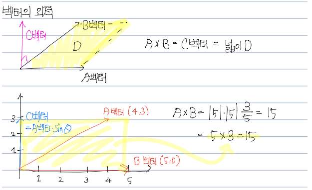 외적 : 벡터의 곱으로 결과값이 벡터를 가짐. (벡터의 차원이 다른경우 행렬이 나옴)