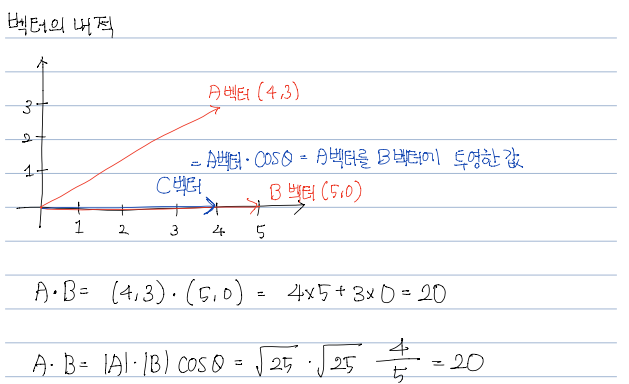 위의 수식이 의미하는 것처럼 A벡터를 B벡터에 대해 투영한 벡터의 길이로 표현할 수 있다.