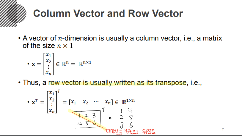 Column vector를 대게 선형대수의 기준으로 사용하고, 이는 n x 1의 matrix라고 표현하기도 합니다. (위에서 행렬의 경우 배열이 모여서 표현한다고 했지만 위의 경우처럼 단순히 하나의 경우로도 표현할 수 있습니다.) Column vector와 달리 Row vector는 Column vector의 Transpose(전치)한 형태로 표현합니다. Transpose는 대각선의 선을 기준으로 행렬을 뒤집은것을 의미합니다. 아래의 예시를 보면 이해가 갈 것이라 생각합니다.