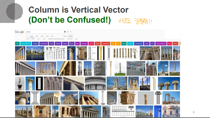 Column vector의 경우 헷갈리기 쉬운데, 위의 사진들처럼 길쭉한 세로의 탑을 생각하시면 됩니다.