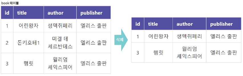 DELETE는 테이블에 있는 데이터를 삭제하는 명령어입니다. 예를 들어, 책 정보를 저장하는 book 테이블에 제목이 '돈키호테 1'인 책을 삭제하는 경우입니다.