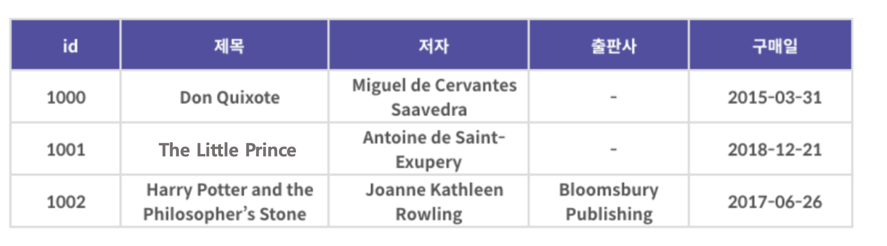 문제 : 책들을 정리해서 조회하기로 하였는데, 내부의 id를 기준으로 출력하니 이용자들이 혼란에 빠졌습니다. 이번에는 책 제목을 기준으로 오름차순 정렬로 조회해보고자 합니다. select문에 order by문을 추가하여 책 제목을 기준으로 오름차순 정렬로 조회해 봅시다.