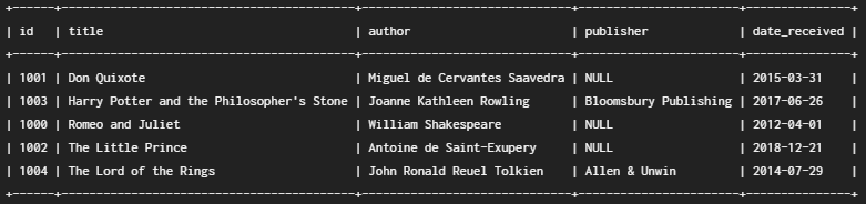 INSERT INTO book(id, title, author, publisher, date_received) VALUES (1001, 'The Little Prince', 'Antoine de Saint-Exupery', NULL, '2018-12-21');