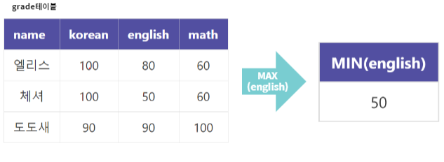MIN은 컬럼의 최솟값을 구하는 함수입니다. 예를 들어, grade 테이블에 저장된 영어 점수 중에서 가장 낮은 점수가 몇 점인지 조회해볼 때 사용할 수 있습니다.