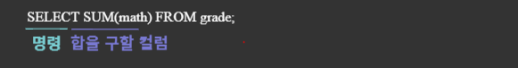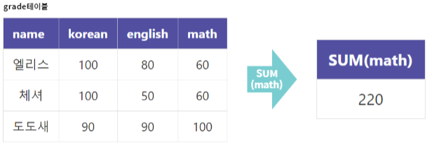 SUM은 컬럼의 값을 더하는 함수입니다. 예를 들어, 중간고사 성적이 담긴 grade 테이블에서 학생들의 수학 성적을 모두 더할 때 사용할 수 있습니다.