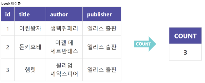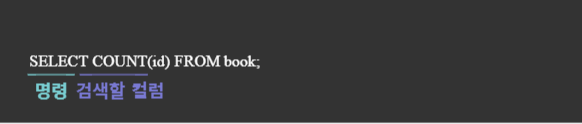 COUNT란 검색한 결과의 데이터의 개수를 가져오는 명령어입니다. 예를 들어, 책 정보를 저장하는 book 테이블에서 전체 책 수를 조회해보려고 할 때 사용할 수 있습니다.