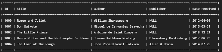 문제 : 엘리스 도서관에 책이 몇 권 더 추가로 들어왔습니다. 이제 도서관에는 책을 한 번에 조회하면 알아볼 수 없을 정도로 많아졌습니다. 혼란스러운 엘리스를 위해 select문 뒤에 limit를 덧붙여 책 정보 5개 만을 조회해보세요!
