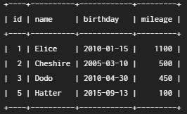 INSERT INTO customer(id, name, birthday, mileage) VALUES(2, 'Cheshire', '2005-03-10', 100);