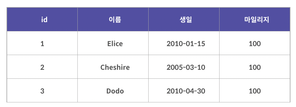INSERT INTO customer(id, name, birthday, mileage) VALUES(1, 'Elice', '2010-01-15', 100);