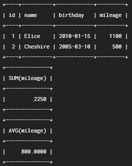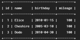 INSERT INTO customer(id, name, birthday, mileage) VALUES(2, 'Cheshire', '2005-03-10', 100);