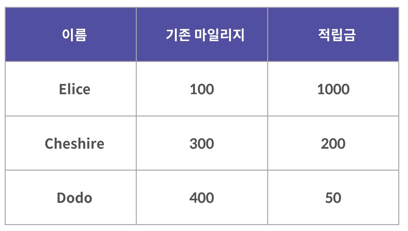 엘리스는 지금 막 오늘 판매한 금액의 정산을 완료하였습니다. 이제 정산된 금액을 토대로 회원들의 마일리지를 적립하여야 합니다. 아래 데이터를 보고 회원들의 마일리지가 적립되도록 해 봅시다.