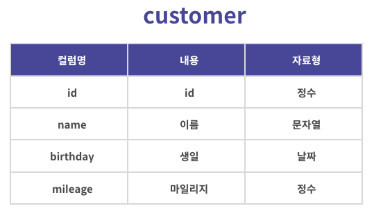 엘리스 가게에서는 회원가입을 통해 구매한 가격만큼 마일리지 혜택을 주려고 합니다. 이를 위해 customer 테이블을 만들고자 합니다. 지시사항에 맞추어 customer 테이블을 완성해 봅시다.