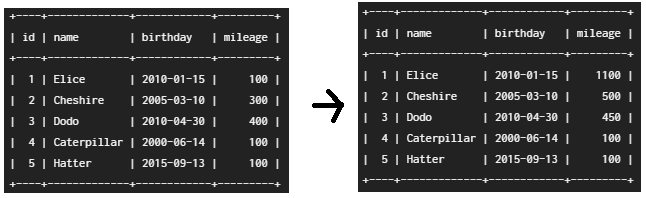 UPDATE customer SET mileage = mileage + 1000 WHERE name = 'Elice';
