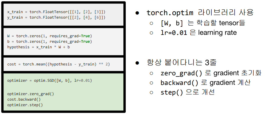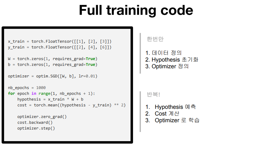 이제까지의 과정을 PyTorch로 정리하면 아래와 같습니다.