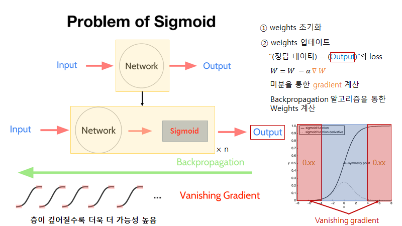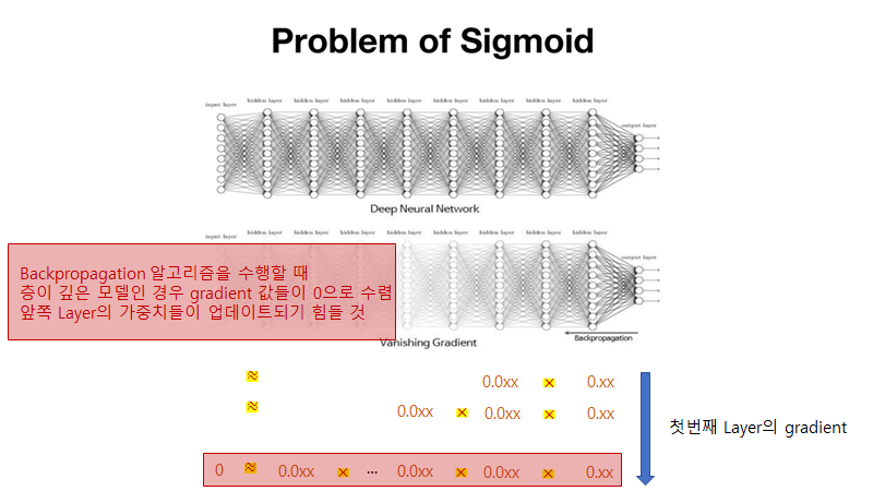 시그모이드의 가장 큰 문제점은 Vanishing Gradient입니다. Vanishing Gradient는 역전파를 하는 과정에서 미분값이 점점 0이나 1로 가는 현상을 의미합니다. 미분 값이 0이나 1로 가게되면 아무리 학습을 진행해도 파라미터의 값은 변하지 않고 학습이 의미가 없게 됩니다. 아래의 사진을 보면 더 잘 이해가 가는데, 신경망이 깊어지게 되면 체인 룰에 의해서 0~1의 값을 게속 곱하게 되고 이는 결국 0으로 수렴한다는 의미입니다. 즉, 초기의 레이어보다는 후자의 레이어에 의해 모델이 생성될 수도 있습니다.