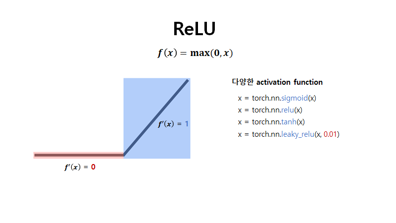 이러한 문제를 해결하기위해 나온 함수가 ReLU입니다. ReLU는 max(0, x)를 의미하는 함수인데, 0보다 작아지게 되면 0이 되는 특징을 가지고 있습니다. 이러한 특징에 의해서 미분 값은 0과 1만을 가지고 계속해서 작아지는 문제를 줄여주게 됩니다.