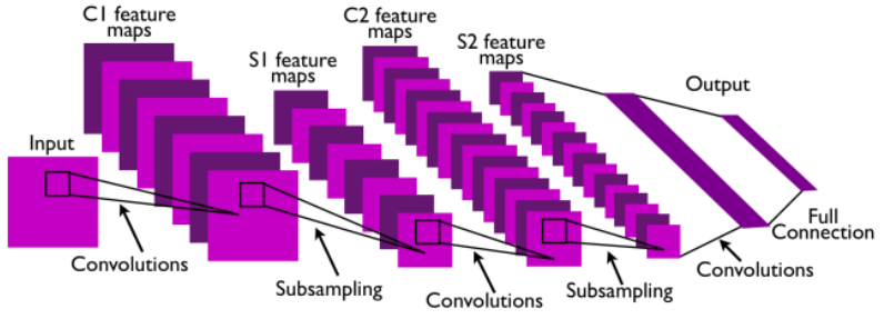 Convolution Neural Network(CNN)의 구조는 위의 사진과 같습니다. 이미지가 들어오면 Convolutions 작업으로 feature maps를 만들어 내고 Subsampling을 통해서 그 사이즈를 줄입니다. 마찬가지로 Convolutions - Subsampling 작업을 반복하다가 마지막에 Full Connection이라는 작업을 통해서 Output(Fully Connected layer)을 산출합니다.