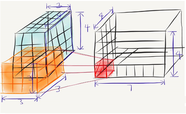 위에서 배운 내용을 한번 정리해보면, 주황색 (3x3x3) filter가 (3x4x4)의 batch를 돌면서 빨간색의 특징을 추출하게 됩니다. Output size는 위의 식처럼 ((4x4) - (3x3) + (2))/1 + 1 = (4x4)가 나오고 마지막 7은 filter의 갯수를 의미합니다. (주황색 filter가 7개가 있음) 참고로 parameter의 수는 3x3x3x7(filter x filter 수)으로 189입니다.