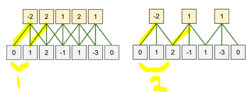 Convolution의 정의에 stride라는 표현이 나오는데, stride는 filter를 한번에 얼마나 이동할 것인가입니다. 아래의 왼쪽 예시에서는 1이고 오른쪽 예시에서는 2인 것을 볼 수 있습니다. stride를 2보다 크게 하는 것은 뒤에서 나오게 되는 Pooling이라는 개념과 같이 데이터 사이즈를 줄이는 것에 있습니다. 가장자리 정보의 손실이 발생하지도 않으면서 특징을 추출하고 같은 정보를 여러 번 선택하지 않으므로 overfitting의 위험도 떨어집니다.